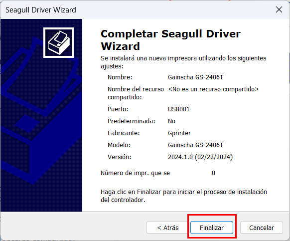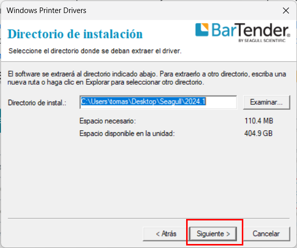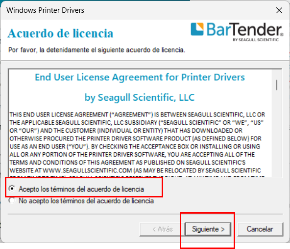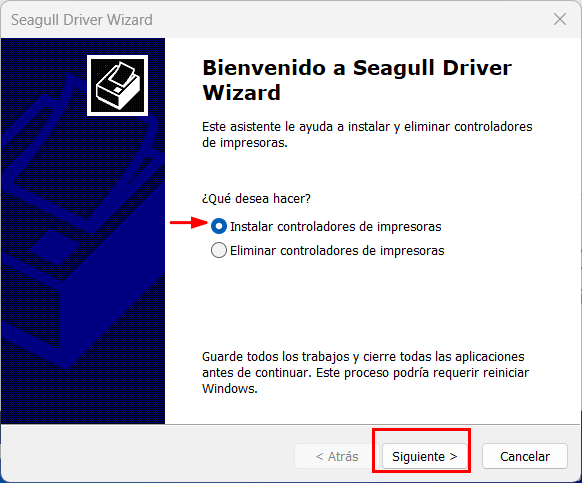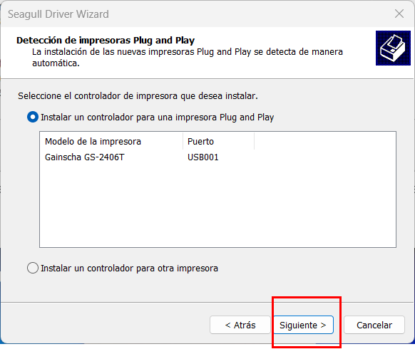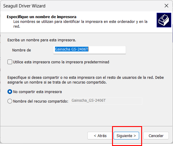 Después instalamos el controlador de immpresora y seleccionamos “Siguiente”: