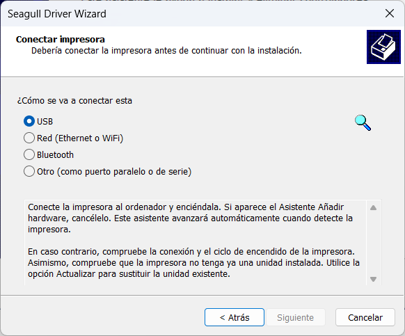 Cuando nos muestre esta ventana, tenemos que conectar la impresora. Si ya la tenía conectada, desconecte el USB y vuelva a conectar:
