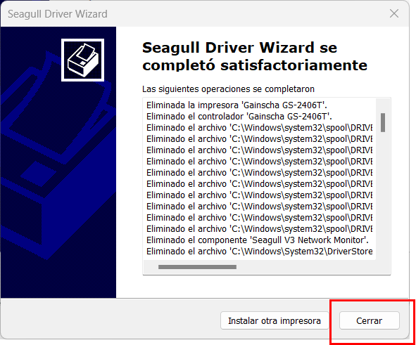 Y deberá repetir los pasos 1-4, pero en el paso 4 usted deberá apretar la opción “Desinstalar controladores de impresora” → apretar todos los controladores de la lista" → “Siguiente” → “Salir”. Luego deberá volver a abrir la aplicación (hacer doble click en zd82118009-certified) que está en su escritorio y repetir los pasos 1-4 pero en el paso 4 usted deberá hacer click en la opción “Instale el controlador de la impresora” y apretar “Acepto los términos de contrato de licencia” → “siguiente”.