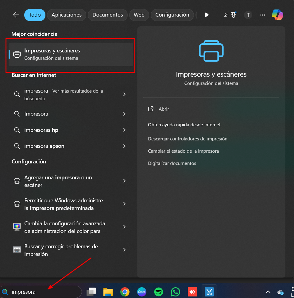 Luego nos vamos al buscador de nuestro computador y escribimos “Impresora”: