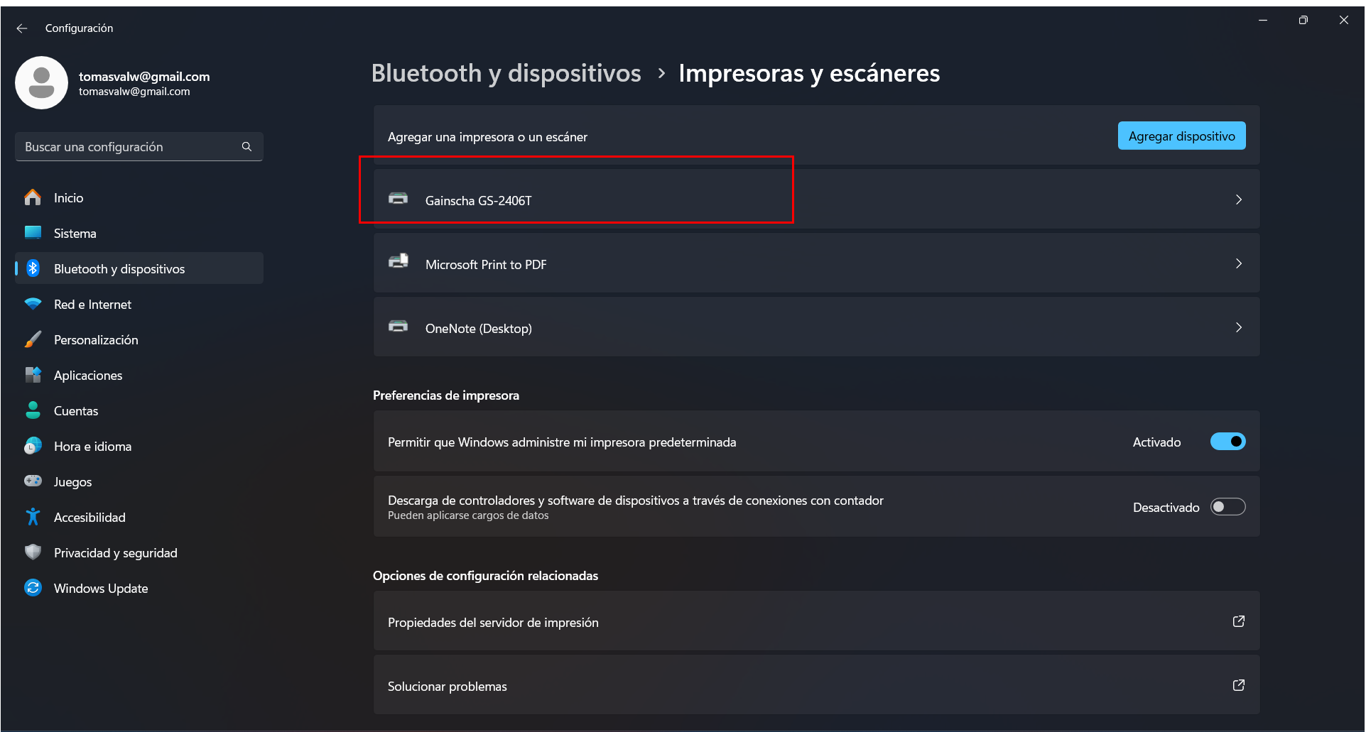 Seleccionamos la opción “Impresoras y escáneres”, y luego buscamos nuestra impresora:
