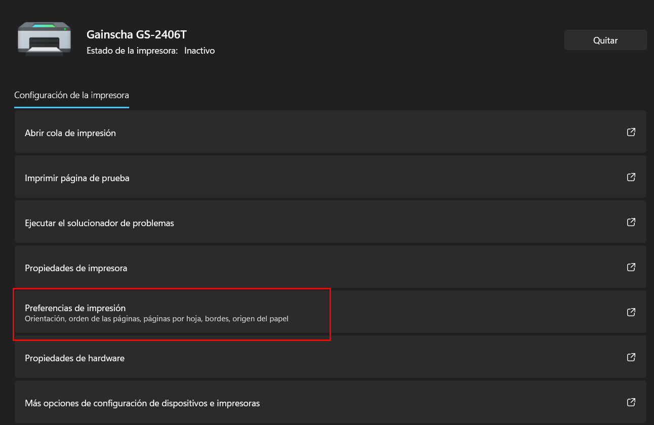 Hacemos click sobre el nombre de la impresora y luego “Preferencias de Impresión”: