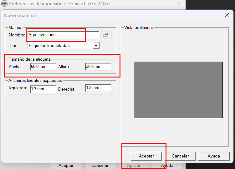 Le cambiamos el nombre a “Agroinventario” y en medidas 60x30 mm, luego aceptamos: