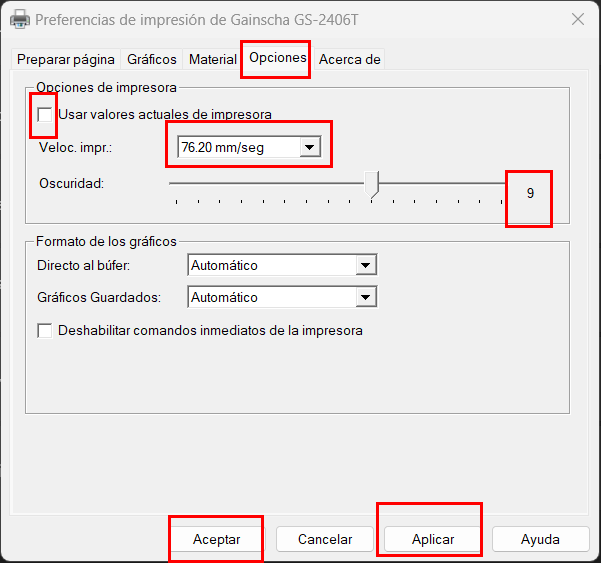 Luego nos vamos a la pestaña “opciones”, deselecionamos la casilla, dejamos la velocidad en 76 y oscuridad en 9, luego seleccionamos “Aplicar” y por último “Aceptar”