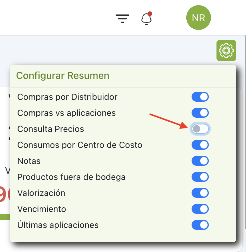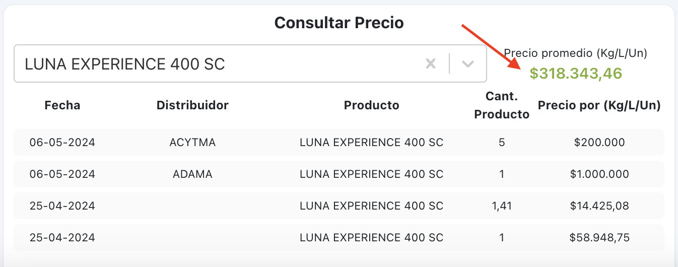 3.- Al seleccionar el producto el sistema mostrará los últimos precios y en verde, al costado derecho del producto indicará el valor promedio de cada producto unitario.
