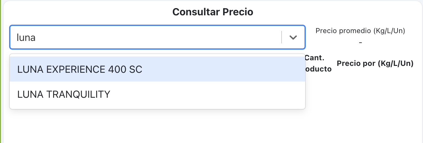 2.- Dentro del dashboard encontraremos el panel llamado “Consultar Precio” , para buscar un producto debemos presionar el desplegable y escribir las primeras letras y el sistema nos dará las opciones disponibles.